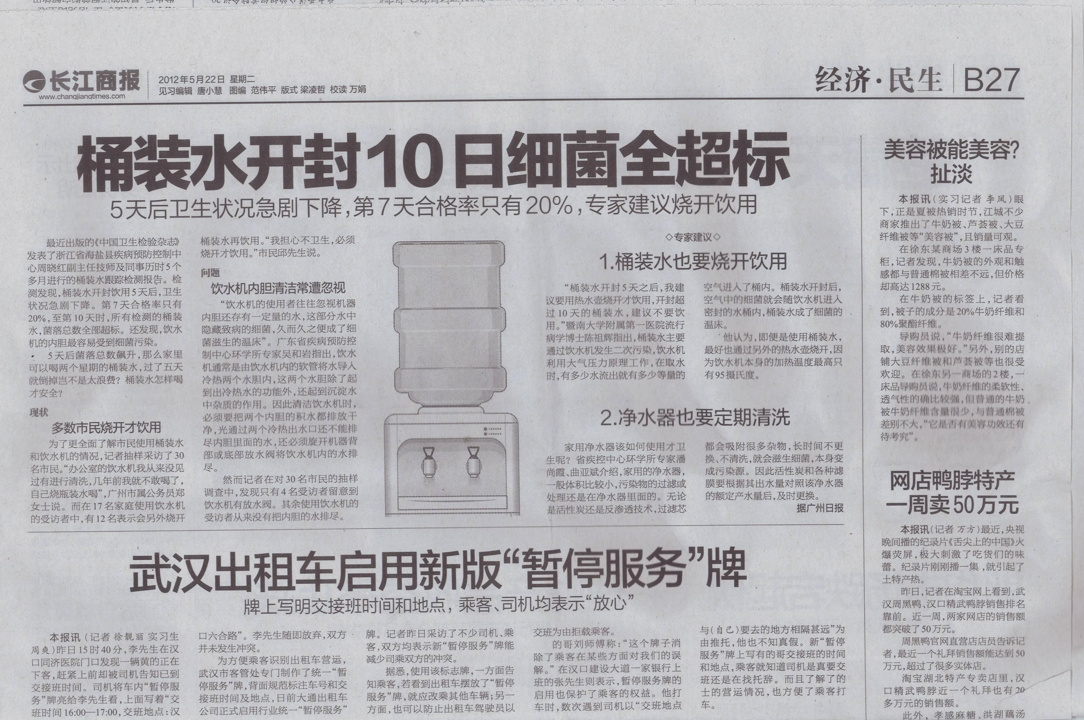 與傳統的自來水、燒開水相比,桶裝水的普及已經成為了飲水方式的第二代,在大部分用戶心中,桶裝水都被認為是干凈、安全的;然而,我國之前進行過多次瓶(桶)裝飲用水產品抽檢,合格率僅為77%,且當桶裝水開封5天衛生狀況急劇下降,第7天合格率僅20%,開封10天細菌全超標(以上簡報摘自長沙商報);