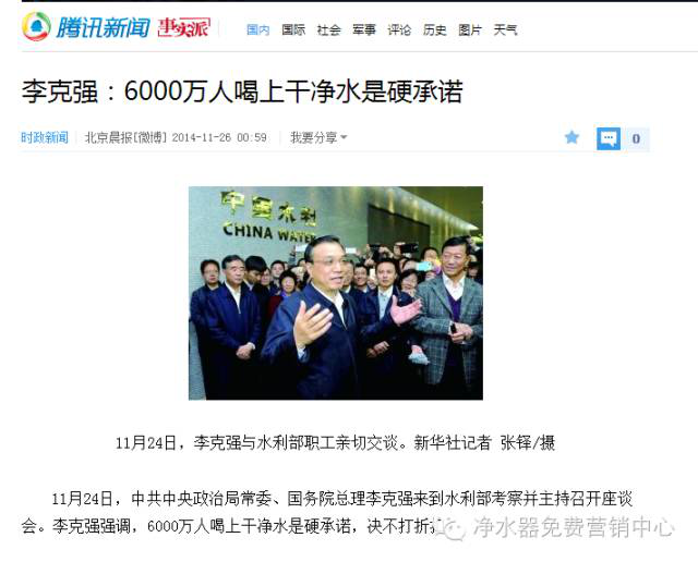 這是李克勤總理在訪問水利部的時(shí)候,官員出示了湖南南縣凈化和沒有凈化過后的水;李克強(qiáng)總理關(guān)切的詢問了,這樣的水凈化出來是否符合國家相關(guān)標(biāo)準(zhǔn),是否能保證當(dāng)?shù)厝嗣竦慕】碉嬎踩?等等一系列的問題。