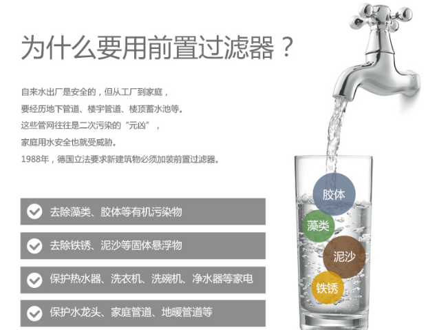 入戶過濾器是對全屋用水進行粗過濾的設備,一般安裝在入戶水表后,可有效去除原水中的顆粒雜質,膠質雜質,解決因水箱、管道二次污染引起的渾濁和懸浮雜質等問題,在保證生活飲用水健康的同時也保護后面的凈水設備。